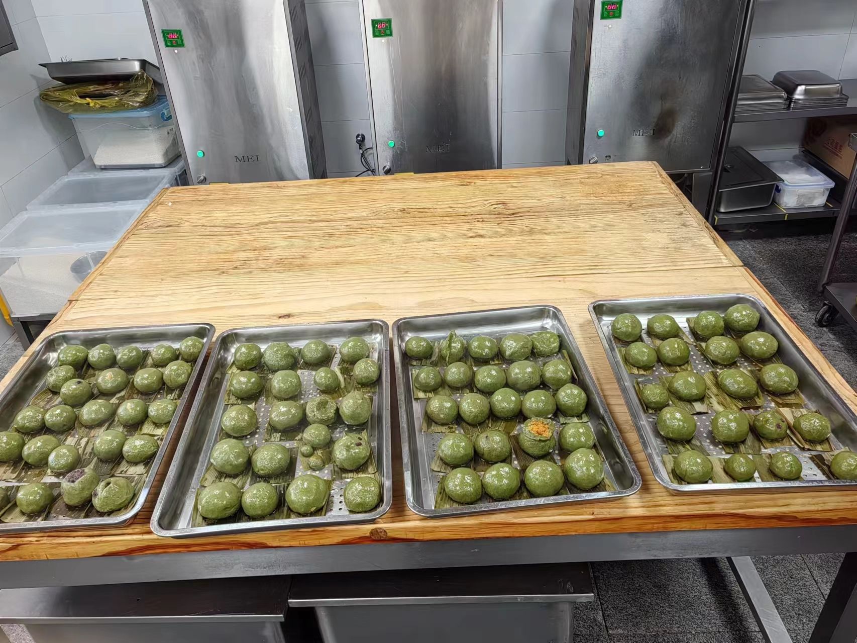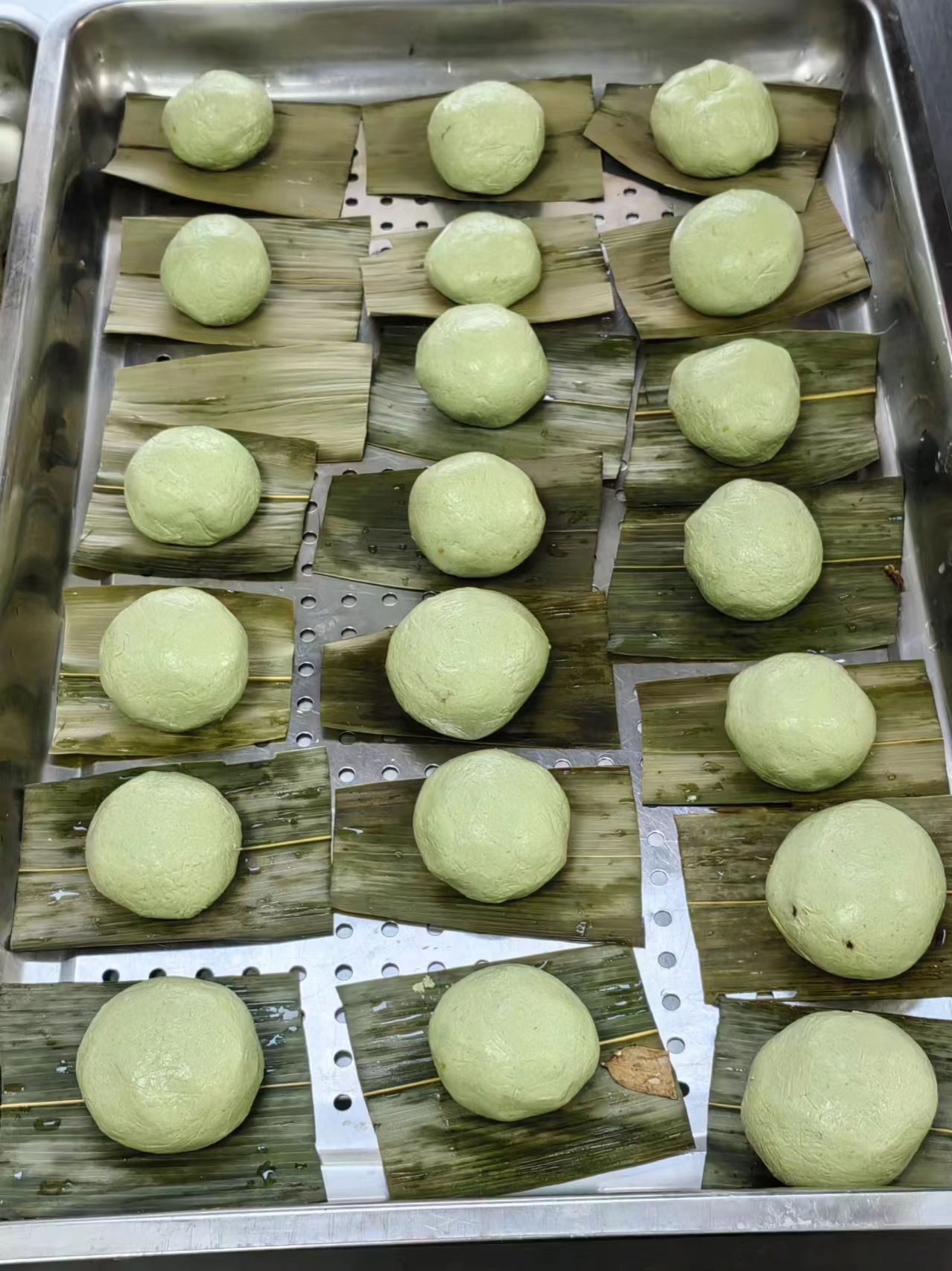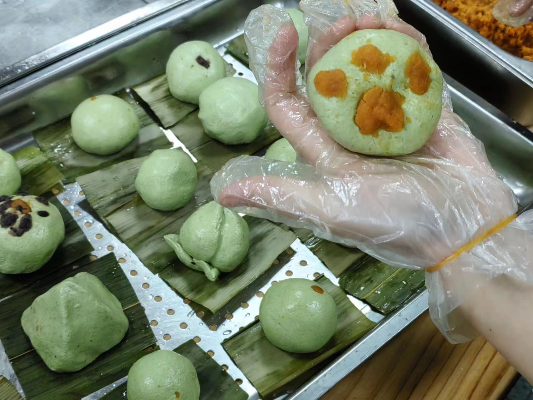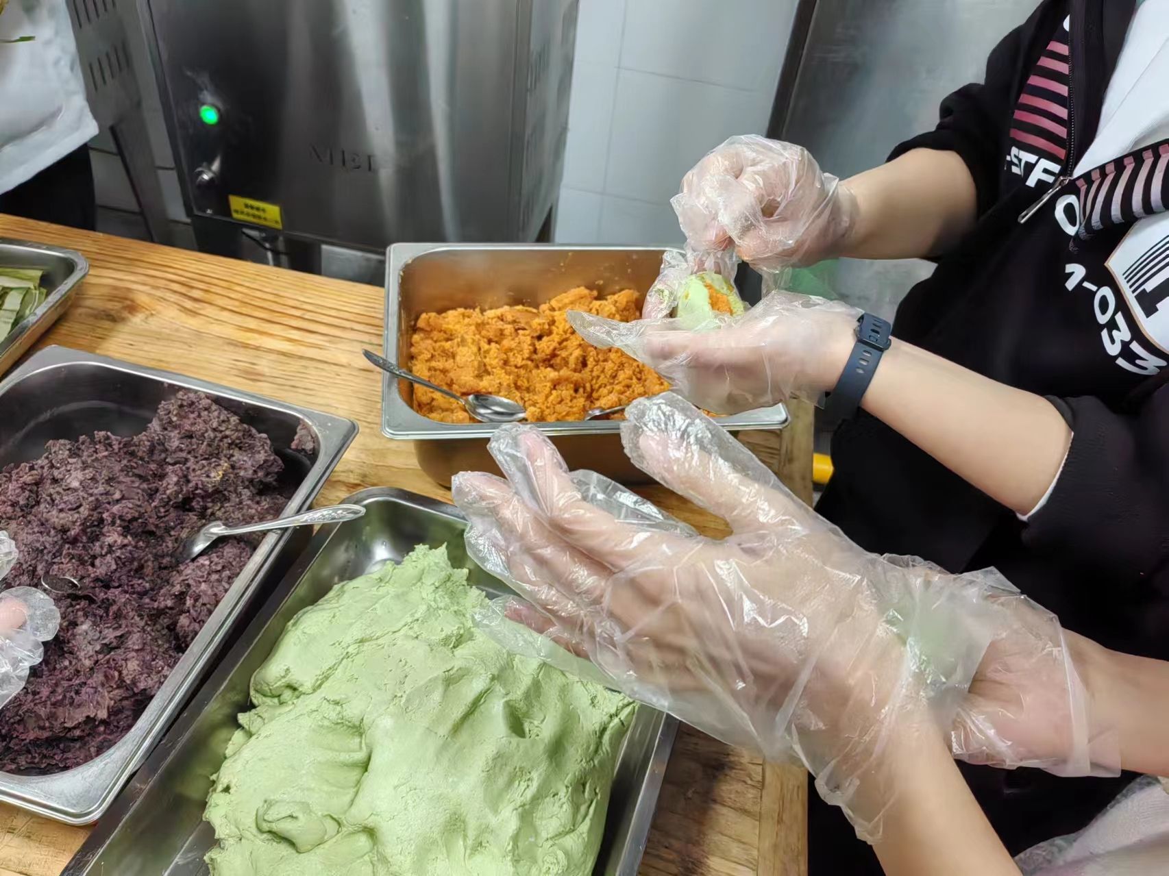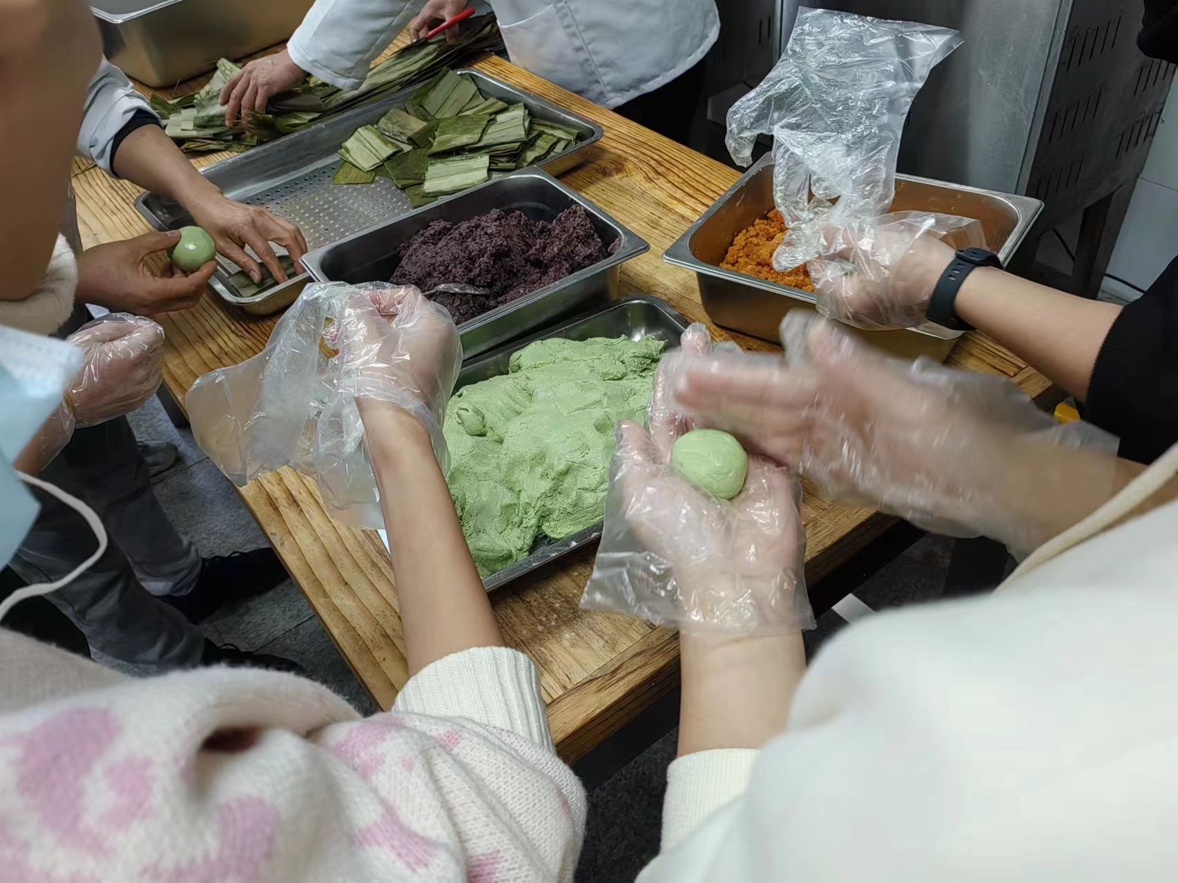 在活动现场,食堂师傅准备好了面团和馅料,为了防止青团粘黏,除了要在面团里加入食用油,还需在蒸笼底部铺满粽叶。师傅们提前将粽叶在水里煮至柔软,随后将它一段段剪开,然后垫在托盘上。随后同学们便分组按照面团50g、豆沙馅或肉松馅20g的比例开始制作。大家边看边学,将面团放于掌心,搓成团,再按压成窝窝头状,添一勺馅塞入其中,用虎口轻轻挤压收口。不一会儿,一个个圆滚滚、胖乎乎的青团就成型了。