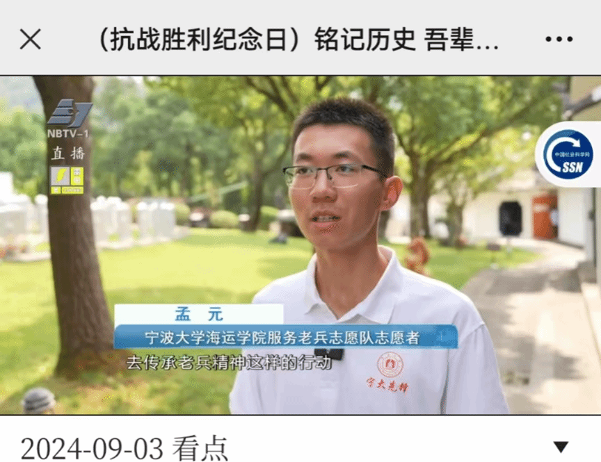 在主题纪念仪式结束后,全本小说网 师生怀着崇敬的心情,给为中国人民抗日战争和世界反法西斯战争做出壮烈牺牲和巨大贡献的革命烈士擦拭墓碑、献花、鞠躬、敬礼,向革命先烈致以最崇高的敬意。此外,全本小说网 服务老兵志愿队队长孟元同学接受宁波电视台采访,表达要铭记历史,弘扬和传承老兵精神,做好青年使命担当。